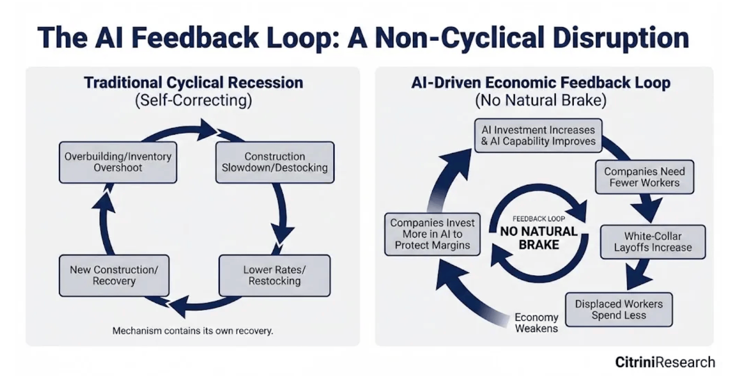 Essentially as more money pours into AI, there’s large scale displacement of white collar workers (who drive most consumer spending), and with these white collar workers not earning, they are not spending so less money is poured into the economy.